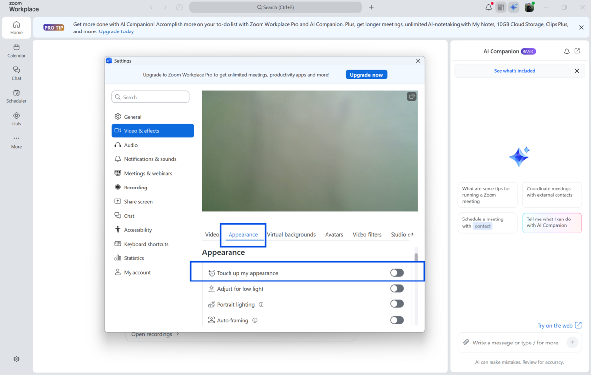 Uncheck "Touch up my appearance" and disable any video filters. These are cosmetic features that quietly burn through CPU cycles.