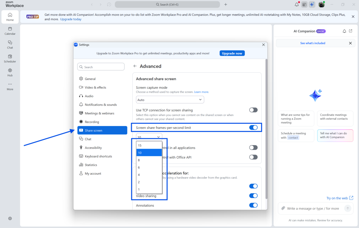 Go to Share Screen settings. Under "Screen Share," set the frame rate to low. Lowering frame rates during screen sharing reduces CPU load and helps keep the call stable.